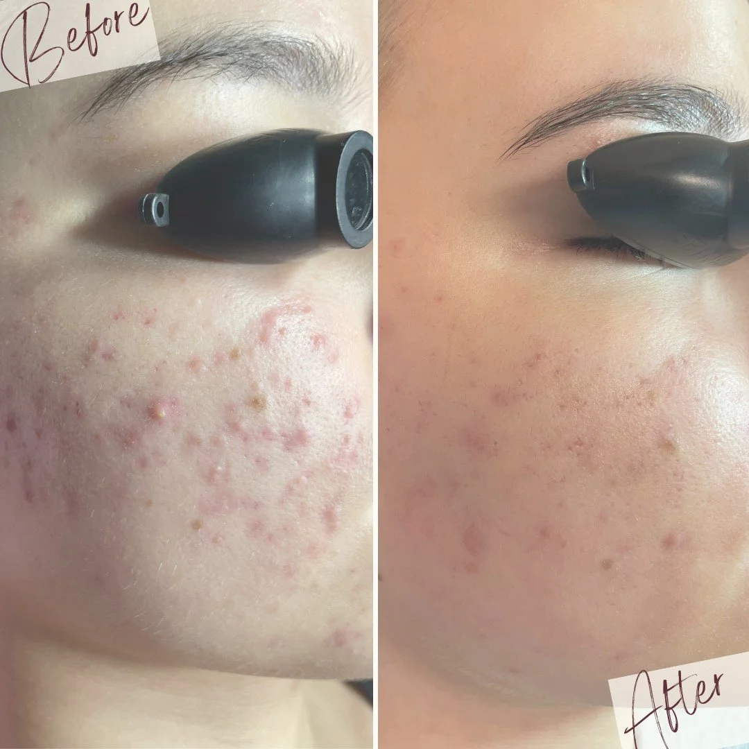 Most clients see noticeable improvement within 6–12 weeks, with full clearing typically in 3–6 months. Consistency with your homecare and scheduled treatments is essential as is patience the first few treatments. You may see skin conditions worsen before improvements.